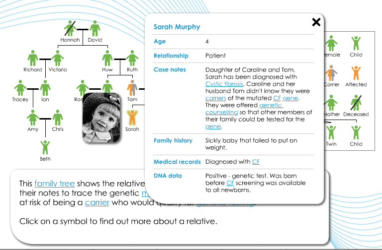 As well as creating around 15 exhibits for a national touring exhibition, Inside DNA, I also made an online Flash game to provide an interactive experience of the work of a genetic counsellor. Search a family tree and decide which members of the family are at the highest risk of being affected by an inherited genetic condition.